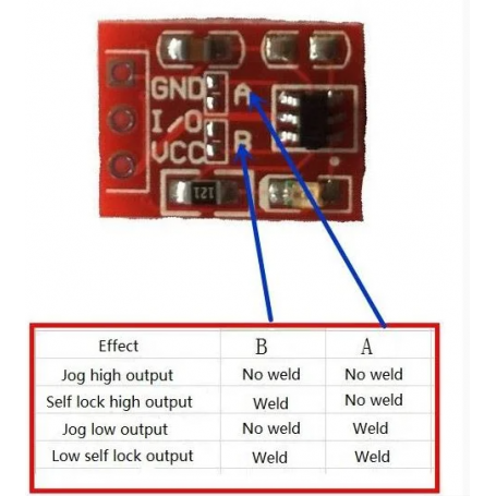 این ماژول توسط جامپر های A , B که در زیر برد در نظر گرفته شده اند، انواع کلید زنی لحظه ای یا دائمی را فراهم میکند. همچنین سطح ولتاژ خروجی ACTIVE HIGHE یا ACTIVE LOW نیز توسط همین دو جامپر قابل تعیین است.