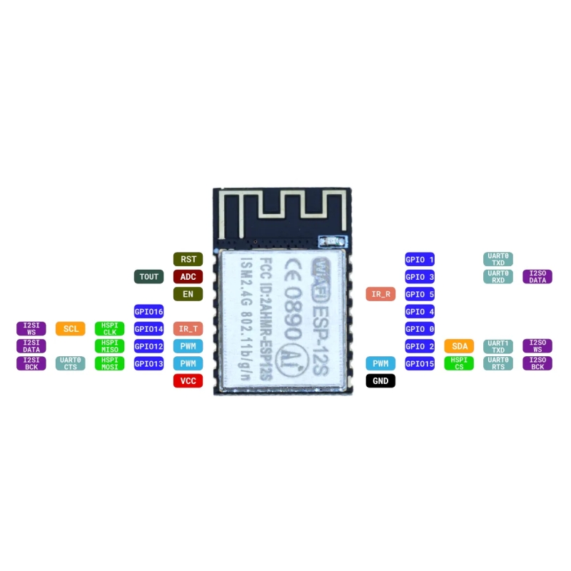 ماژول ESP8266-12S نسخهای بهینهشده از سری ESP-12 است که توسط شرکت Ai-Thinker تولید شده و بر پایه تراشه ESP8266 طراحی شده است. این ماژول دارای پردازنده ۳۲ بیتی Tensilica L106 با مصرف توان بسیار پایین بوده و از طریق آنتن PCB داخلی، ارتباط وایفای با استاندارد 802.11 b/g/n را فراهم میکند. ESP8266-12S قابلیت عملکرد در حالتهای مختلف Station، SoftAP و ترکیبی (Station+AP) را دارد و با دارا بودن پروتکل TCP/IP داخلی، مبدل ADC، پورتهای ارتباطی متنوع و امکان توسعه نرمافزاری با SDK یا AT Command، گزینهای مناسب برای پروژههای اینترنت اشیا، خانه هوشمند، و کنترل از راه دور است.